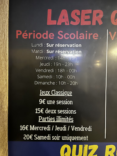 Read moreLe quiz sympathique, la première partie de laser game entre nous bien meme si manque d’éclairage, problème avec l’arme d’un de nos joueurs ayant gâché l’ambiance au cours de la partie l’arme a été signale comme défaillante sans aucun échange pour s’entendre dire « on ne peut pas changer le gilet encours de partie » j’ ai ressenti une certaine nonchalance « limite on s’en fou » de la par des l’employés deuxième parties prise après la première ou l’employer nous indique que nous serons seuls, nous étions tous contents d’être entre nous, un groupe arrive et je me retourne vers l’employé et je lui demande une autre tranche, et la que de blabla pour nous faire comprendre que cela ne sera jamais possible à nouveau l’arme défaillante mais celle.ci a été échangé direct par l’arme précédente déjà défaillante du foutage de gueule ! Et du mensonge j’ai trouvé cela trop bizarre du laxisme a fond et manque de professionnalisme. Puis six contre 14 personnes pas le poids, des règles que personnes ne respectent, un des nos joueurs contre nous, très mauvaise organisations Enfin bref je ne recommande pas ce laser game mais plutôt celui de pierrelaye qui plus sympas et mieux que celui-ci. Je ne recommande pas du...