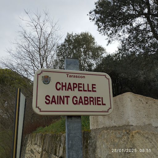 Prosper Mérimée ayant constaté l'importance de cet édifice, l'a inclus dans la toute première liste des monuments historiques établie en 1840. St Gabriel apparait, (sous le nom de chapelle) dans cet inventaire avec 933 autres constructions méritant d'être entretenues pour être conservées. Le visiteur qui connaît l’art roman est tout de suite étonné par la richesse du décor de la façade, rare pour une construction romane de la fin du XII siècle. Détaillons cette façade. Au dessus de la porte le tympan en plein cintre reposant sur deux petites colonnes représente à gauche Daniel entouré de deux lions, puis l'ange qui tient par les cheveux Habaquq (également Habacuc) chargé d’apporter un panier de nourriture à Daniel. Sur la droite Adam et Eve, de part et d'autre du serpent enroulé dans un figuier, cachent leur nudité après avoir succombés à la tentation. Autour de la porte d’entrée deux colonnes à chapiteaux corinthiens décorés de feuilles d’acanthes supportent un fronton triangulaire que coiffe l’agneau pascal. La position de cette statue qui parait coincée n'est guère esthétique. Elle semble avoir été rapportée à cet emplacement. Sur ce fronton à gauche et au centre l’Annonciation de l'archange Gabriel à Marie. Remarquez l'orthographe latine de GABRIHEL avec un H. A droite, la Visitation de Marie à Elisabeth, elle-même enceinte de Jean-Baptiste qui la reconnaît comme la mère du Messie et l’embrasse. Les personnages s’inscrivent dans trois arcades avec dans les creux quatre oiseaux dont trois ont un fruit dans le bec. Une quatrième arcade qui débute à gauche donne à penser que ce bas-relief est peut-être un réemploi. Les inscriptions sont faites de signes lapidaires identiques à ceux que l'on trouve sur les murs intérieurs et extérieurs de la chapelle.