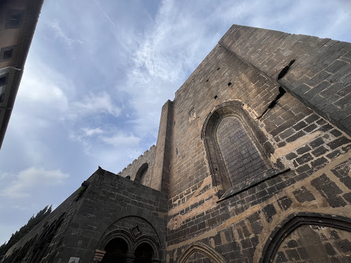 Quelle surprise de découvrir cette cathédrale si différente des autres ! Construite en pierre basaltique noire issue du volcan local, elle dégage une impression de puissance, presque militaire. Elle ressemble plus à une forteresse qu’à un lieu de culte traditionnel, avec ses hauts murs, ses créneaux et son donjon de 35 mètres qui domine la ville. 🏰