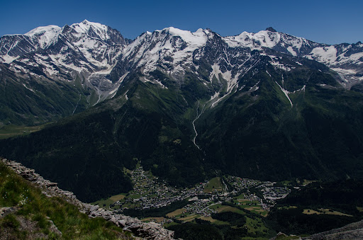 2500m peak. 3 hours climbing from Les Contamines Montjoie. worth to take a trip from the steep north slopes and go down on the south. amazing view over the Mont Blanc. if its clear you can see the Italian, the Swiss and the Frensh Alps at the same time - bring suncream :) take a full day...