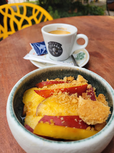 What a gem!!!! It was a literal oasis for us as it was 36C and roasting that day. It's owned by a lovely couple - Helene runs the front of house and her husband is the chef. A delicious and well curated wine list that I would have been proud to pour during my wine bar days, lots of options and well priced (25€ muscadet was like mana from heaven in the heat). We didn't eat as it was too hot but iced coffee was great, strawberry juice refreshed and the wine saved us. Our water jug was topped with cold water as often as we wanted and the menu did look really good. We had so much fun that we just stayed there and skipped the jardin as the heat was too much. Music was a mix of classic French tracks and the shade and seating was very comfortable. Make sure you stop in and support this excellent independent...