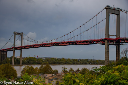 Pont d'Aquitaine le deuxième pont de Bordeaux qui a bien changé depuis. Ouvert le 6 mai 1967, d'une longueur de 1767m, 20,90 de large avec une porté de 393,75m de 58m de hauteur et deux pylônes de 103m de haut. Jadis celui ci possédé 2x2 voie de circulation dont une voie supplémentaire de libre, d'alternance ouvert au côté qui avait besoin d'être désengorgé suivant l'affluence, marqué par des signalisations faite de croix rouge ou flèche verte pour savoir qu'elle voie pouvait être emprunté ou pas, le tout éclairé par des néons de couleur orange qui lui donné son charme, aujourd'hui remplacé par des blanc. Le plus grand pont construit de Bordeaux et 2ème pont qui traverse la Garonne après le pont de pierre qui a subit de grande transformation après avoir couru à la catastrophe car longtemps abandonné de maintenance, en 1979- 14 ruptures de câbles, 1984- 68 ruptures, 1993- 178 ruptures et c'est en 1998 qu'il fût le plus fragilisé et qu'il risqué s'écrouler si rien n'était fait mettant en péril ou ruine l'ouvrage. Celui-ci c'est vu offrir de tout nouveaux câbles de suspension et dont une traverse qui de a été déporté pour l'agrandissement à 2x3voies et de nouvelles traverses (tenons) jadis de 4 passé à 2, avec toujours une voie cyclables de chaque côté du pont. Jadis du côté rive droite sur le pylône était peint un œil puis une figure avec 3 yeux aujourd'hui effacé que beaucoup d'ancien se rappelleront. Pont suspendu de l'autoroute a630 ou de l'autoroute a10 celui-ci donne accès à la rocade relié aujourd'hui par le pont François Mitterrand de l'autre côté vers les rives d'Arçin qui permet de faire tout le tour de Bordeaux et qui à aussi permit de désengorger le pont d'Aquitaine de tout l'affluence de circulation même si aujourd'hui il y a encore de nombreux embouteillages, tout les jours sur chacun des deux ponts. On peut même ressentir le pond se mouvoir lors d'embouteillage dessus lors de grand vent. Le pont d'Aquitaine deuxième pont de Bordeaux c'est vu attribué des mérites comme classé 80ème rang mondiale de pont suspendu et 8ème rang français en terme de longueur. Il reste emblématique de la ville de Bordeaux et aux riverains...