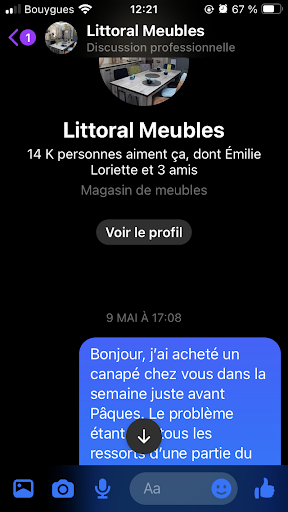Achat dâun canapĂ© le 16/03/24. Paiement en cash. Livraison rapide, lĂ dessus aucun problĂšme La semaine dâaprĂšs, alors que jâĂ©tais assise dans le canapĂ©, un bruit de craquement. On y fait pas trop attention, puis ça lĂ refait plusieurs fois dans les jours qui ont suivis, tous au niveau de la mĂȘme assise. RĂ©sultats : tous les ressorts de lâassise sont morts, il y a littĂ©ralement un creux dans le canapĂ© lĂ oĂč on sâassoit puisque plus rien en dessous pour le retenir. Lâassise est de plus en plus enfoncĂ©e, rien Ă faire⊠Je contacte Littoral Meuble il y a pratiquement deux mois via Facebook, on me demande la facture, jâenvoie tout. On me dit quâils vont mâenvoyer quelquâun, finalement non. Je renvoie plusieurs messages sans rĂ©ponses, jâai finalement Ă nouveau une rĂ©ponse dimanche 16juin, on me dit quâon mâenvoie quelquâun dans la semaine. Finalement encore personne nâest venu. Depuis le 9mai je leur dis quâil y a un dĂ©faut, rien est fait. Ca ne peut pas venir de lâutilisation puisque nous nâavons pas dâenfants, personne qui pourrait « sauter » sur le canapĂ© et jâai une activitĂ© professionnelle je ne passe pas mes journĂ©es dans le canapĂ© au point de lâavoir usĂ© en 1mois. ExtrĂȘmement déçu de la qualitĂ© et du service, je ne recommande pas. En regardant les commentaires jâai vu que dâautres personnes ont eu le mĂȘme soucis⊠Nous sommes allĂ© Ă littoral meuble parce que nous nâavions pas les moyens de mettre 1000⏠dans un canapĂ©, finalement nous allons devoir en...