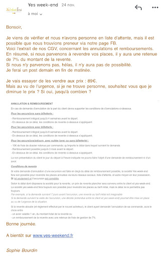 Malheureusement, le soir du jeudi 23 novembre, j’apprends le décès d’un de mes proches. Sachant que l’excursion était complète, j’essaye donc d’appeler la société Yes Week-End pour tenter de trouver une solution, et laisser notre place à de potentiels intéressés car nous devons être auprès des notre. Pas de réponse. J’essaye par sms, pas de réponse. Par mail, pas de réponse. Je décide donc de passer par le biais des réseaux sociaux et cette fois ci, on me fait un retour.