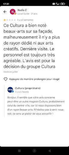Read moreJ'apprécie énormément les articles de ce magasin mais beaucoup moins le fait de me faire surveiller par un membre du personnel alors que je suis avec ma fille et qu'on ne fait rien de mal... je suis restée au rayon ésotérique pendant 10 minutes et du début à la fin, il est resté là, tout près, à regarder mes moindres faits et gestes. Je suis dans l'incompréhension totale ! Lorsque je suis partie, comme par hasard, il est parti faire autre chose. Je parle bien du Cultura Avenue de Paris, dans l'autre je n'ai jamais eu ce souci. C'est vraiment très désagréable surtout que je n'ai absolument rien à me reprocher ! Je n'y...