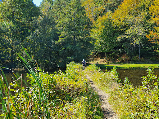 Ce joli lac, du nom de la rivière qui le traverse et l'alimente, s'inscrit dans un grand parc de 165 hectares. Toutes sortes de loisirs peuvent y être pratiquées, des activités nautiques au golf (avec un parcours 18 trous, par 70, de 5 433 m, plus une école de golf et un hôtel-restaurant), en passant par "l'accrobranche" au parc de loisirs Mayaventure. Sur les photos, mon tour du lac avec le VTTAE, fort agréable et assez long (un peu plus de 8 km) mais dont le balisage est quelque peu rudimentaire. Pour ceux qui sont intéressés, je recommande de suivre les marques vertes, quand...