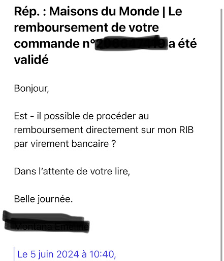 Read moreJe fais une rĂ©clamation au nom de ma mĂšre, cliente depuis 25 ans et qui ne mettra plus jamais les pieds chez Maison du Monde Ă cause de sa derniĂšre expĂ©rience. Et ça vaudra pour toute la famille. Il y a deux semaines, elle a achetĂ© pour 4500 e de canapĂ© et meubles avec Ingrid la responsable du rayon meubles. 6 jours aprĂšs, elle a souhaitĂ© exercer son droit de rĂ©tractation car les plans de la maison on changĂ©. Impossible dâĂȘtre remboursĂ©e, aprĂšs divers appels au service client qui lui dit quâils ne peuvent faire que des avoirs et que câest au magasin de faire le remboursement en carte bleu, le magasin dit lâinverse et refuse quâelle passe sur place en discuter. Une personne du service client a dit que câĂ©tait ok pour rembourser et finalement Ingrid dit que cette personne se fera taper sur les doigts. En sachant les sommes quâelle a laissĂ© dans cette enseigne, et les projets Ă venir, câĂ©tait beaucoup plus que 4500 e de chiffre dâaffaires quâelle sâapprĂȘtait Ă laisser Ă lâenseigne. Finalement, elle utilisera son avoir et ne remettra plus les pieds chez maison du monde, déçue du temps perdu avec le service client et du manque de prise en considĂ©ration de ses besoins. PS : aprĂšs 15 jours, elle nâa toujours pas reçu son avoir. Elle a achetĂ© au nom de sa sociĂ©tĂ© et câest bien Ă©crit dans les cgv de Maison du monde quâil y a un droit de rĂ©tractation de 30 jours avec remboursement. Je vous fait parvenir un courrier recommandĂ© dans la foulĂ©e, si ça ne fonctionne que pour les achats en ligne...