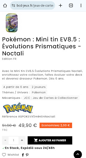 Read moreBoutique qui depuis quelques temps surfe sur la vague hype Pokémon en augmentant très significativement ses prix de vente pour des articles à peine sortis. À titre d'exemple : mini tins Évolutions Prismatiques de 29,9€ et même 49,90€ pour le modèle "Noctali". Et je ne parle pas des autres articles (display EV3 à 499€?). Rajouter à cela une "fausse" promotion de -2€ sur l'article. À fuir quand on sait que le PVC de ce type d'article est situé entre 12 et 13€. Coucou @Asmodee. On peut comprendre que certaines petites boutiques puissent augmenter leur prix face au peu de stock et à la demande, mais de là à revendre officiellement des articles 3 à 4 fois leur prix conseillé c'est vraiment abuser des clients et des collectionneurs. Bravo BCD vous pouvez être fiers de vous, vous êtes plus chers que les scalpeurs...