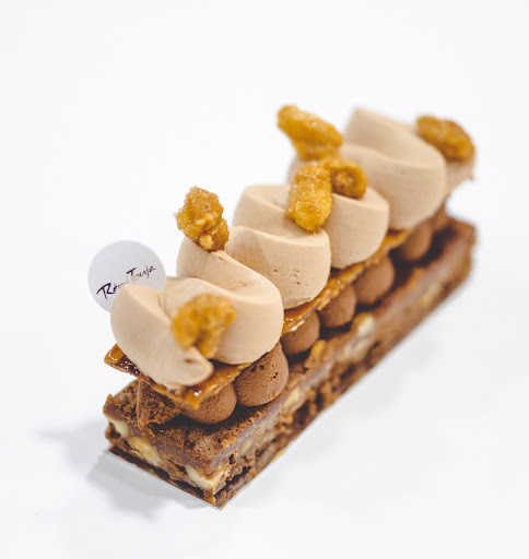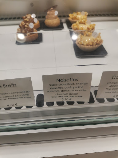 Une belle découverte. Lorsque vous entrez dans la boutique et que vous voyez le chef et son équipe travailler devant vous, vous savez qu'au moins les pâtisseries que vous allez déguster sont préparées avec soin et précision. Le jour de ma visite, ils venaient de sortir les panettones du four et étaient en train d'enrober des chocolats, vous pouvez donc imaginer le parfum qui s'en dégageait. La variété des gâteaux individuels est vraiment remarquable, de sorte que, que vous préfériez quelque chose de fruité, de noisette ou que vous vouliez simplement du chocolat, il y a quelque chose de parfait pour votre envie. Mais soyez prêts à essayer des saveurs sophistiquées et complexes, car les pâtisseries ne sont pas des gâteaux classiques (qui sont également bons s'ils sont bien préparés). Après avoir réfléchi, j'ai opté pour l'Emma et le Breizh (et un cookie :) pour mon retour à l'hôtel). Commençons par le cookie. Pas un simple cookie ... Parfaitement cuit, un peu croustillant sur les bords et tendre, mais pas trop mou, à l'intérieur. Le chocolat est très bon et les noix sont magnifiquement grillées. Cela vaut vraiment la peine :) L'Emma est tout simplement incroyable. Avant d'entrer dans les détails, il suffit de regarder la décoration et les nombreuses élaborations que l'on peut voir pour se rendre compte que c'est quelque chose à apprécier. La tuile sur le dessus est si savoureuse. La saveur de noix et de sucré est une belle façon de commencer. Ensuite, vous prenez une cuillère pleine avec une combinaison de ganache, de mousse, de biscuit au maïs et de praliné au maïs et aux amandes, et vous serez au paradis de la saveur pendant quelques instants. Je mettrais l'accent sur le biscuit et le praliné, qui sont vraiment formidables. D'ailleurs, l'association de l'enrobage extérieur au chocolat avec la mousse est également très réussie. Premier gâteau, premier succès. Ensuite, j'ai goûté le Breizh. Un peu plus simple que l'Emma au niveau des préparations, mais vraiment bon aussi. J'ai essayé les préparations une à une et ensemble et les deux valent vraiment la peine. La compote de pommes avait une merveilleuse combinaison d'acidité et de douceur. Elle rappelait un peu les prunes. La couche de caramel, onctueuse, dorée et savoureuse, est parfaite. Ma seule objection concerne le sablé breton. Le goût et la cuisson sont parfaits, mais je pense que la conservation n'était pas optimale. En tout cas, j'ai adoré ce gâteau aussi. Si j'en ai la possibilité, je reviendrai une autre fois avant de quitter Carcassonne pour d'autres...
