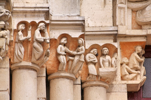 Levez le nez! Tout en haut de la Tour ...un nid de cigognes et pourtant nous ne sommes pas en Alsace mais sur les bords de la Loire où batraciens et petits poissons doivent être un Menu de Choix. Menu Menu disions nous .... Laissez votre regard descendre sur la façade jusqu'au tympan de la Grande Porte ... Surprise! Le Maitre de la Cuisine, des fourneaux, Alexandre Dumaine y est représenté, coiffé de sa Toque de cuisinier....de Chef! Né ici, de retour à Digoin lorsqu'il a quitté les cuisines du Restaurant étoilé "la Côte...