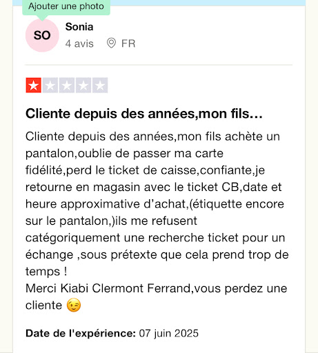 Read moreExpérience très décevante au Kiabi de Clermont-Ferrand. J’ai pourtant l’habitude d’acheter chez Kiabi, mais cette fois-ci, le service était loin d’être à la hauteur.