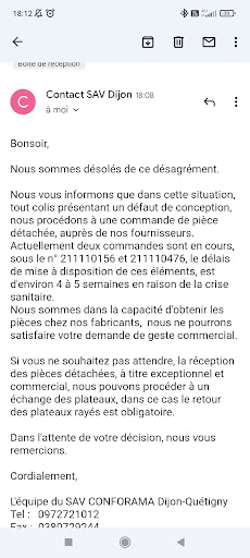 Je me suis rendue une première fois au service client pour demander un remboursement, on me l'a refusé et on m'a dit qu'un remplacement de l'assise pouvait être réalisé. J'ai signifié que cela ne me convenait pas, car pour un fauteuil à ce prix, on est en droit d'attendre qu'il tienne plus de six mois. J'ai donc signifié que je demandais au fabricant un remboursement. On le saura, Conforama n'assume pas ses propres ventes ! C'est au fabricant de déterminer si la clientèle Conforama mérite ou non d'être considérée.