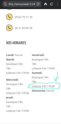Read moreUn peu déçue de mon 1er passage. On m'avait vantĂ© la Recyclade et en consultant le site, j'Ă©tais convaincue de faire une bonne action en donnant un vieil aspirateur qui fonctionnait encore, 2 miroirs Ă recycler et des vĂȘtements. Sur le site, il est Ă©crit qu'ils rĂ©cupĂšrent des vieux objets pour en faire d'autres ou les revendre tels quels s'ils sont en Ă©tat. J'adore l'idĂ©e ! Donc banco. Accueil trĂšs froid au dĂ©pĂŽt car le samedi n'est pas le meilleur jour... Ok, j'entends. DĂ©solĂ©e de travailler en semaine et ce n'Ă©tait pas Ă©crit qu'il ne fallait pas venir donner le samedi. Mais bon... Les vĂȘtements sont tout de suite acceptĂ©s mais pas le reste. Motif : ce n'est pas neuf. Ils ne transforment plus les choses car pas de temps. Ok.... Pas grave, je vais aller Ă la dĂ©chĂšterie (qui a d'ailleurs tout mis dans le coin de ceux qui veulent rĂ©cupĂ©rer car l'Ă©tat n'Ă©tait pas si mauvais que cela đ). Cette dame a ajoutĂ© que de toutes façons,ils ont trop de dons !!! Et plus d'atelier de rĂ©paration. Je pense que je suis tombĂ©e sur la mauvaise personne (ou alors il faut mettre le site Ă jour pour expliquer les changements d'orientation). Pas polie, revĂȘche, dĂ©sagrĂ©able... Déçue ! Mais...