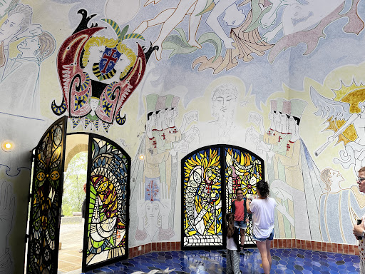 Read moreA voir, le site est magnifique. Surnommée Chapelle Cocteau, elle est nichée au cœur d'un parc (marche 10 min, parking à l'entrée). Elle a été construite en 1963 l'année de la mort de Jean Cocteau et achevée fidèlement aux dessins de l'auteur. De plan octogonal, elle est couverte d'une coupole percée et entourée à l'extérieur d'une galerie ouverte ou se trouve de belles mosaiques mises en place en 1992 selon des dessins de Cocteau et représentant l'ancien testament. A l'intérieur les peintures de Cocteau représentent les périodes de la Passion et de la Résurrection du Christ. Et les vitraux symbolisent les croisades, également le sol superbe en céramique bleue avec la croix rouge des Croisades et la mention Dieu le veult (Cocteau était grand maître de l'ordre de...