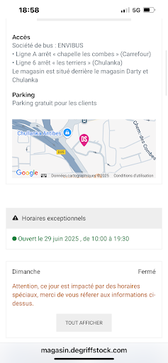 Read moreVenue exprès pour jeter un œil car il y avait marqué sur le site que le magasin était ouvert ce dimanche jusqu’à 19h30 , arrivée à 18h35 , on me dit que ça ferme , que je dois juste regarder vite fait et me dépêcher, et ne rien essayer !!! Avec les technologies que l’on a à présent , mettre les bons horaires sur le site me semble la base pour éviter que l’on se déplace pour rien, et que surtout on est plus envie du tout...