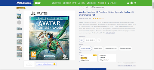Read moreQuelle mauvaise foi et quelle malhonnĂȘtetĂ© de l'Ă©quipe ! Nous recherchions le jeu Avatar Frontiers of Pandora sur PS, un jeu annoncĂ© sur le site micromania.fr Ă 59.99âŹ. Notez au passage que le site affiche clairement que le jeu est exclusivement vendu en boutique et donc Ă ce prix.