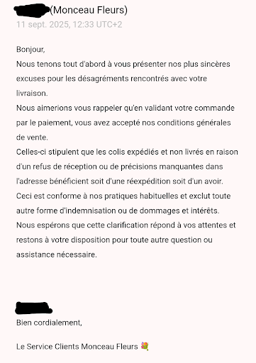 Read moreJ'ai commandé un bouquet en livraison pour le 25/12 qui devait être un cadeau pour Noël. Il n'est jamais arrivé, on m'a répondu qu'il y avait un bug et que la livraison pourrait être reprogrammée le 28/12. Bon...le cadeau n'a plus la même valeur n'était pas livré le jour même de Noël mais pourquoi pas. Jamais arrivé. "Il y a un bug, nous pourrons reprogrammer la livraison le 30/12". Jamais arrivé non plus. J'ai tenté de contacter le service client, silence radio. Je n'ai jamais été remboursée pour mon bouquet jamais livré. Ne proposez pas un service de livraison si même au bout de 3 fois vous n'êtes pas capable de l'assumer, d'autant plus à 800m de...