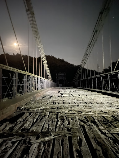 Très beau pont... Mais une grille et un mur de parpaings en ferme l'entrée ! En effet il semble que le revêtement de la chaussée en bois soit très endommagé. La conservation du patrimoine coûte cher ;-) Résultats le petit resto bar est fermé (mais pas à cause de la covid !) Lieux triste, à l'abandon. Belles roches...