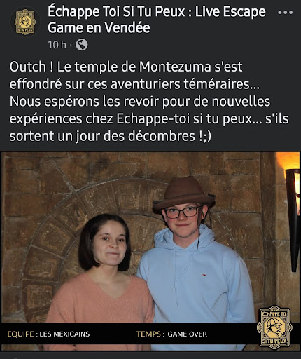 Read moreExcellent acceuil. Facile à trouver et à se garer (parking gratuit). Le maitre du jeu qui nous a accueilli était très sympathique et disponible. 1 casier est proposé gratuitement pour déposer ses affaires. Les jeux sont répartis en 4 catégories: énigme, physique, agilité et salles mystères avec 4 thèmes (cirque, pirate, spatial et western) et le tout sur 3 niveaux de difficultés (facile, moyen et difficile). Réalisé à 3 : couple avec un enfant de 10 ans qui a adoré. Sur 16 salles en moyenne vous pouvez réaliser 6 salles. Décors top. Mention spéciale à la salle rodéo et shérif qui ronfle 😉. N'hésitez pas à faire appel au maitre du jeu car certaines énigmes ont besoin d'un petit coup de pouce. Juste un petit bémol,1h ça passe très vite, il serait top de proposer plusieurs forfaits comme dans les prison island : 1h, 1h30 ou 2h de jeux. Nous recommandons fortement, l'équipe...