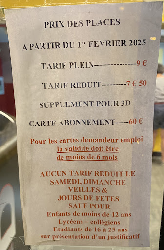 Il y a une place de parking pour stationnement handicapĂ© juste devant le cinĂ©ma, il y a une rampe pour handicapĂ©s, des toilettes adaptĂ© pour handicapĂ©s, mais pas de tarifs rĂ©duits pour handicapĂ©s, uniquement pour les enfants de moins de 12 ans, lycĂ©ens, collĂ©giens, Ă©tudiants de 16 Ă 25 ans sur justificatif, et les demandeurs dâemploi (la validitĂ© doit ĂȘtre de moins de 6 mois) ⊠bizarre. Et pour aller Ă la salle, il fallait longer un long couloir, avec quelques marches dâescalier, puis au fond du couloir, il fallait monter un grand escalier pour monter Ă lâĂ©tage. On nâa pas demandĂ© si il y avait un ascenseur puisquâon a vu le grand escalier que quand on est arrivĂ© au bout du couloir. Ce nâĂ©tait pas adaptĂ© pour une chaise roulante. Heureusement que ma copine marchait avec une canne, mais elle a eu quand mĂȘme des difficultĂ©s Ă monter les marches. Câest dommage pour les tarifs rĂ©duits qui nâincluaient pas les personnes handicapĂ©s.
