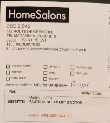 Read morePas facile l'achat d'un canapé par les temps qui courent. Il y a tellement de magasins dans la région, qu'on ne sait plus ou aller. Nous avons décidé de nous diriger route de Grenoble à Saint- Priest. Première visite chez HomeSalons. Accueil sympathique de l'équipe ou Justine s'est occupée de nous, après nous avoir laissé un moment (et, ça c'est bien agréable) pour regarder les différents modèles. Il y en a pour tous les goûts. Notre choix s'est porté, rapidement, sur le modèle "Louis" (prénom de notre petit-fils !!!!) ......tout en mettant tout notre temps pour l'essayer. Pour info : c'est un produit Made in Italie. Niveau prix : une remise au départ......et on n'en parle plus. Même si vous essayez de faire baisser la note, il vous faudra rebrousser chemin et aller voir ailleurs. Ici, on ne joue pas les marchands de tapis. Commande passée le 4 novembre 2024. Livraison hier soir, lundi 10 février(nous n'étions pas disponibles en janvier). La livraison s'est fort bien passée. 2 jeunes livreurs, sympathiques et vraiment professionnels, nous l'ont installée ou nous le souhaitions avec une infinie précaution. Comme c'était un convertible, ils ont fait la manipulation pour voir si tout était en ordre. Pour finir, ils ont repris l'ancien canapé.... un vrai travail de pro. De plus, ils nous ont laissé notre intérieur comme ils l'avaient trouvé. Merci à eux. Chez HomeSalons, il y a un prix à payer (mais loin d'être les plus chers) mais vous avez un meuble de qualité. Nous espérons que les futurs acheteurs auront la même satisfaction que...