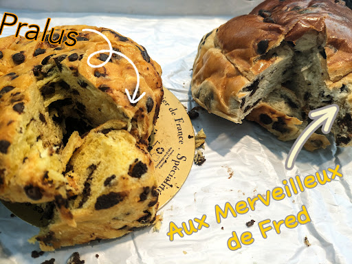 Look: Pralus' has a golden color (maybe due to more butter?) and more chocolate chips both outside and inside the brioche. AMF's is pale. ✅ PRALUS