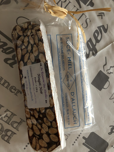 Il était une fois , une dame qui se rendait régulièrement en novembre à la S-A -V-I-M de sa ville natale , Marseille car elle aimait les bons produits de terroir Français et une année ?? au fait, peu importe quand !!, la gourmande y fit un très très belle découverte qui allait s'ajouter aux antérieures: "Au Royaume des Abeilles" mais quel Royaume !!qui se construisit au fil du temps car le sympathique Sébastien orchestrait son immense savoir faire ""nougatier""dans un petit labo jusqu'à il y a une année de cela, où désormais il a pignon sur rue dans ce beau village d'Allauch qui fait fasse au mien, sa boutique honore fortement ce village Provençal; c'est un petit bijou et avec un peu de chance vous le verrez "in live" fabriquer SON NOUGAT ,oui le sien , le blanc ,le noir , des déclinaisons sucrées liées au miel : chiques , suce-miel etc --Tout est 100% NATUREL...