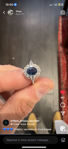 Et plus rĂ©cemment : Ma bague de fiançailles, rĂ©alisĂ©e sur mesure. William a pris le temps de nous conseiller, de nous guider dans les choix, et jâai pu sĂ©lectionner moi-mĂȘme la pierre et la forme que je souhaitais.