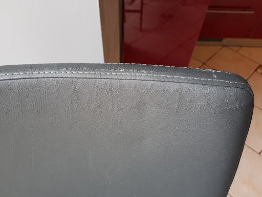 Je tiens à préciser que je n'ai jamais agressé le simili cuir avec des produits d'entretien. Comme on le voit sur mes photos, c'est clairement aux zones de frottement que le simili s'est abîmé. Si mes passages d'éponge ou de chiffon micro fibre avaient abîmé mes tabourets, ils seraient...