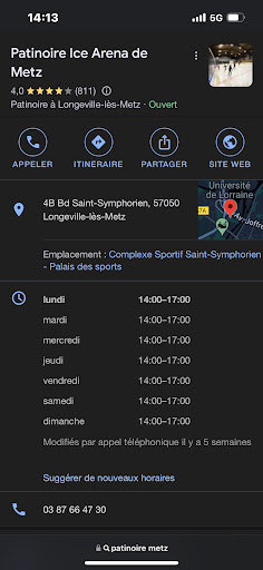 Read moreDommage qu'on ne puisse pas mettre 0, samedi après midi en famille, des racailles plein la patinoire qui bousculent nos enfants en bas âge volontairement en rigolant pour provoquer le parents. Nous osons intervenir afin qu'ils arrêtent puisque la sécurité ne le fait pas, les petites frappes nous tombent dessus à plusieurs, nous menacent devant les vigiles et nos enfants. Réponse des surveillants, "nous avons vu ce qui s'est passé Monsieur, patinez sur le bord, n'allez pas au centre de la patinoire" Vous ne virez pas les individus qui agressent tout le monde ? Bien sûr que non, ils se connaissent tous. Pour finir comité d'accueil à la sortie après m'être fait menacé devant ma fille de 5 ans. C'est la première fois que je vois une patinoire aussi malfamé, n'y allé pas avec vos enfants . Belle image de la ville de Metz félicitations monsieur...