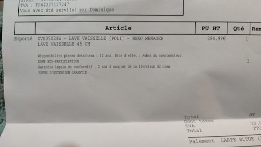 Read moreSi le personnel est agréable et serviable, le choix des marques vendues est à revoir. J'ai acheté un lave vaisselle de marque BEKO classe A, donc pas une entrée de gamme. En panne à Un an et un mois. La pompe ne marche plus Le technicien est venu rapidement et m'a dit "commande d'une pompe neuve, environ 10 jours". Voici 15 jours que j'attends sans nouvelle. Ils ont répondu à mon appel par leur incapacité à se faire livrer une pompe qui arrive certainement de Turquie à pieds. L'été arrive et avec lui, la famille et je fais toujours ma vaisselle à la main !!!!! Quel est le constructeur incapable de fournir une pièce détachée pour un appareil d'un an ?...