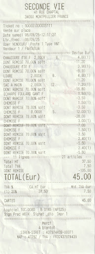Bonjour, je me suis rendue à la journée promotionnelle à 70% pour acheter des vetements. Voici le ticket qui m' a été remis : il mentionne 21 articles . Je rentre chez moi il n'y en a que 13 ! La ligne : 8,000 x 5 mentionne des articles que je n'ai pas acheté. problème : la vendeuse refuse de le reconnaitre et me dit que c'est une histoire de code, que c'est une vieille machine, que le nombre d'articles ne doit pas être prix en compte et que si je ne suis pas contente j'ai qu'à aller voir le patron ! Dont acte ! c'est la troisième fois que ça m'arrive: la première fois une (autre) vendeuse m'avait rendu la monnaie sur 20 euros alors que j'avais donné 50 € elle ne voulait pas l'admettre et j'ai du insister pour qu'elle recompte sa caisse, l'erreur était bien là et elle m'a remboursé la différence. La deuxième fois, un article en trop figure aussi sur le ticket , mais j'avais été plus réactive et je m'en été aperçue à la sortie du magasin! la vendeuse a commencé par nier vigoureusement , puis comme je venais juste de sortir de l'enseigne, j'ai montré les articles tout de suite, elle a reconnu péniblement la situation et m' a fait un avoir car ils ne remboursent pas ! Je pose ça là : une erreur ok, 2 puis 3 ça fait beaucoup ! Vérifiez les tickets et le nombre d'articles si vous achetez chez cette enseigne ! à bon entendeur salut et...