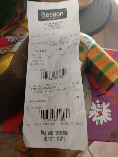 Read moreJe suis allez acheter une que dis je plusieurs paires de chaussures pour un enfant… J'avais pris un sac à l'entrée et une fois en caisse, je tombe sur une jeune femme limite agréable mais pleine de réflexion, je lui demande ou je met le sac qui m'as servit à transporter mes articles, elle me répond bah de toute façon je serais obligé d'allez le ranger. Bah je sais pas cocotte, demande à ton bosse d'installer un portique roulant. Tu dépense 200 balles et tu n'as même pas le droit à du respect. tu n'as pas encore payé, qu'elle passe déjà au client suivant devant cette attitude, je suis partie sans dire au revoir… Je ne sais même pas si elle à vue que j'étais sortie du magasin J'ai l'occasion d'allez dans d'autre Besson… Niveau accueil et courtoisie, Nîmes est une honte. Je rappellerais juste à ces employés, que si salaire en fin de mois, c'est que client dépense, merci d'accrocher un minima de politesse et de...