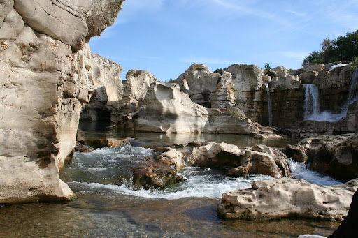 Dimanche, j'avais besoin de me changer les idées et les chemins de campagne m'ont conduite vers ce jolie village de la Roque sur Cèze, petit village médiéval, construit sur un piton rocheux et offrant une vue splendide sur les cascades du Sautadet. Ce village, tout de pierres vêtues où le soleil semble pris dans ses ruelles d'une autre époque, les parant d'une jolie couleur dorée, est un vrai petit bijou. Mes pas m'ont ensuite amenés naturellement aux cascades du Sautadet qui sont juste à ses pieds. j'y accede par un pont médiéval étroit, enjambe la rivière de ses 11 arches. La Cèze y coule paisiblement, large et bordée d'arbres se reflétant dans son miroir. Des pécheurs sur le gravier, la canne lancée, attrapent de beaux poissons, nombreux à cet endroit. En quittant le pont, je me dirige vers la droite. J'entends un grondement qui s'amplifie au fur et à mesure de mon avancée. Le paysage se dépouille et laisse place à un plateau de roche calcaire qui tout d'un coup bascule. Ces roches ont cinq millions d'années. Elle saute et tressaute, traçant et creusant son chemin depuis des temps lointains. La Cèze est une artiste qui sculpte dans la pierre des formes bien étranges comme les marmites de Géant ! Cavités (certaines ont quelques mètres de diamètre) creusées dans le lit rocheux de la rivière par le mouvement tourbillonnant de ses galets. Car la Cèze n'est pas toujours sereine et sait se mettre en colère dans un débordement tumultueux. Le spectacle est magnifique autant qu'inattendu car brutale. Nous passons de la calme nonchalance, à l'impétuosité et à une force brute et puissante qui découpent le calcaire aussi facilement qu'une motte de beurre L'endroit n'est pas sans danger et regorge de pièges Attention où l'on met les pieds car une glissade pourrait être fatale. Je m'assois sur la pierre blanche, polie et façonnée par la puissance de la rivière et laisse mon regard courir avec l'eau. C'est hypnotisant, c'est beau. La rivière traverse cette espace calcaire et va continuer son chemin en reprenant tranquillement son cours, contente d'avoir joué sur les toboggans de la nature. Elle offre alors ses plages de galets aux baigneurs et l'on entend les rires des enfants batifolant dans ses eaux claires.