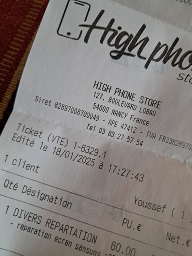 Read moreFranchement après avoir fait réparer mon téléphone chez le réparateur a Auchan sapinière qui m'ont dépouillé sur le prix de l'écran et la qualité très mauvaise j'ai payé 79€ et le pire c'est qu'il a cassé un bout du téléphone bref je ne pouvais entendre seulement en haut parleur et chez high phone j'ai trouvé de vrais professionnels et payé 59€ donc 2€ de moins tout de même et niveau acceuil que ce soit le responsable au réparateur qui d'ailleurs sont très respectueux,polis et ne snob pas leurs clients donc maintenant le téléphone fonctionne parfaitement. Je recommande les yeux fermés ce high phone store qui vous rendra franchement service et je me répète mais ce sont de vrais professionnels avec un dépôt de Stock où il ne faut pas 1 semaine pour recevoir une pièce et donc son téléphone encore un grand merci je vais vous faire de la pub et...