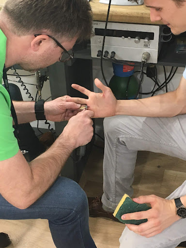 (ci-dessous, M. Griffon en train de m'aider à garder ma main droite en un...