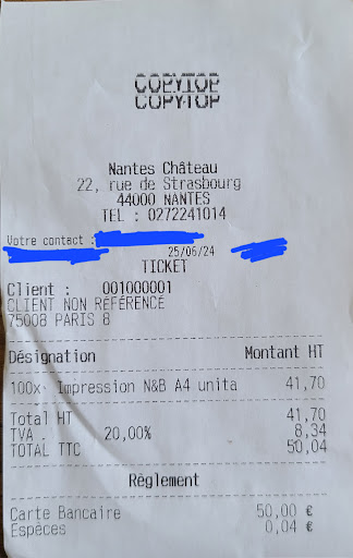 Read moreC’était le jeudi 3 avril vers 18h40. En me faisant imprimer des documents dans ce magasin, on m’a remis par erreur, on m'a remis des feuilles qui n'étaient pas les miennes, ce qui a créé un malentendu. Je n'avais pas vérifié avant de payer pour 21 pages à 15 euros, alors qu'il en manquait une dans ma commande initiale. Il serait utile que le personnel vérifie les adresses e-mail et invite les clients à vérifier leurs documents avant de payer. De plus, un remboursement pour les documents incorrects serait apprécié dans ce type de situation.