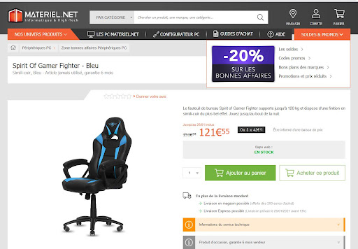 Read moreJe suis client, enfin j'étais client Materiel.net depuis de nombreuses années. J'ai acheté un siege gamer Spirit of gamer mi-décembre 2020 au prix de 139,94 Euros ; cadeau de Noël pour mon fils. 25/12 : déballage du cadeau, mais pas de chance, 2 accoudoirs gauche, le siege n'est pas montable. 28/12 : suite appel auprès du SAV, on m'indique que le nécessaire va être fait après du fabricant. 08/01 : je relance le SAV, qui me fait une réponse standard .... SAV en cours, nous allons contacter le fabricant pour qu'il nous indique un délai. 10/01 : nouvelle relance, je signale au SAV qu'un autre modèle est équipé des même accoudoirs, et leur propose de me remettre l'accoudoir manquant afin de clore ce SAV, qui concerne je le rappel un cadeau de Noël !!! 11/01 : refus de cette solution de la part du SAV. On me propose de retourner le siege pour remboursement. Mais, c'est à moi de payer les frais de renvoi !! alors même que le produit n'est pas conforme ... 14/01 : je ramène le produit au magasin de Nantes .... 18/01 : confirmation de réception de mon retour 24/01 : a ce jour le remboursement n'est pas fait. JE CONSTATE QUE LE SIEGE EST REMIS EN VENTE SUR LE SITE, IL EST PRECISE QUE L'EMBALLAGE EST OUVERT MAIS JAMAIS UTILISé. entre temps, le pris à évolué, puisque le siège est maintenant à 151,94 Euros, avec une remise puisque l'emballage est ouvert 121,55 Euros. A noter que sur LDLC (même groupe que Materiel.net), c'est 106,36. Si je me connecte avec mon compte client, ça repasse à 151,94. Drôle de pratiques pour ce site e-commerce .... je suis déçu et ne manquerai pas de le faire savoir. Je me demande si ils le vendent avec à nouveau 2 accoudoirs gauche, ce qui pour rappel, le rends immontable. De plus, je doute que le fait d'augmenter le prix, avant d'annoncer une remise soit légal. A bon...