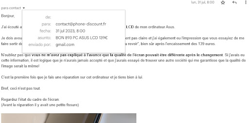 Read moreEndroit absolument Ă fuir : le patron est dĂ©sagrĂ©able, essaye de vous voler pour tout et n'importe quoi ! Je suis venue dans ce magasin pour imprimer mes documents, j'ai attendu 40 minutes devant un Ă©cran blanc bloquĂ© Ă cause de leur mauvaise connexion et vieux ordinateurs sans antivirus. Et ce n'est pas la premiĂšre fois que cela arrive. La derniĂšre goutte a Ă©tĂ© que le gĂ©rant me fait payer pour les 40 minutes comme si j'avais naviguĂ© sur internet alors qu'il voyait bien que ses ordinateurs Ă©taient en beug. Lorsque je lui fais la remarque pour dire que c'est injuste de me faire payer pour ce que je n'ai pas utilisĂ©, il me dit " ben c'est pas de ma faute que internet rame, si vous n'ĂȘtes pas contente allez voir ailleurs" en sachant que cela fait des annĂ©es que moi et ma famille sont clients chez lui, et juste pour cette raison je fermais les yeux sur beaucoup de choses, comme aussi par exemple qu'il m'as prit ma planchette Ă la rĂ©paration en laissant trainer 2 mois, sans rĂ©ponse aux appels, messages vocaux, et Ă mes passages en boutique, pour au final me dire que c'est irrĂ©parable Lisez d'autres commentaires et n'y allez pas chez eux , car le patron est de mauvaise foi, devenant agressif lorsqu'on lui fait...