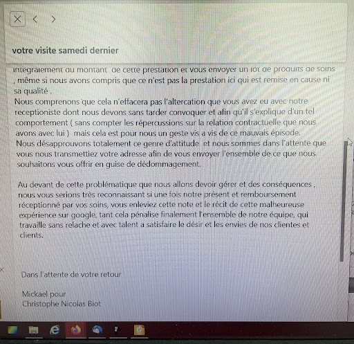 Read moreA FUIRE IMPERATIVEMENT Cela faisait plus d'un mois, que nous avions programmé mon amie et moi de se faire coiffer dans ce salon soit disant professionnel. Tout d'abord, nous avions pris rendez vous avec Mr Biot car nous voulions le MUST soit disant , la prestation par personne était de 260 e, je pensais que la prestation serait à la hauteur du tarif mais pas du tout. Tout d'abord, le salon a changé 2 fois nos horaires de rendez vous sans explication et surtout sans excuse. Ensuite, 1er déconvenue, Mr Biot est en retard.. Puis, nous sommes reçu par un autre Mr avec un fort accent et surtout une attitude très condescendante, qui nous fait savoir que notre poussette gêne fortement. Il ne comprend pas que nous sommes avec une poussette et se demande où habituellement, nous allons nous faire coiffer avec une poussette. Je lui indique gentiment que si les poussettes ne sont pas admises, il faudrait le stipuler sur leur site. Et la, il me fait savoir qu'il n 'a pas à me donner le mètre carré de son établissement, que je peux aller me faire coiffer ailleurs etc etc .. Là, mes bras m'en tombent, je décide de repartir n'ayant pas de solution pour ma poussette YOYO. Il est fort désagréable d'avoir attendu ce rendez vous, d'être mal reçu, de ne pas se faire coiffer et surtout ne pas avoir cherché une solution.. Ce Mr Biot n'a pas daigné descendre pour essayer de trouver une solution, mais pour qui se prend t il?? Il lui reste un long chemin à faire dans l'apprentissage de l’accueil et fidélisation des clients. Il règne dans ce salon une ambiance de cathédrale où tout le monde a peur on dirait. Quel manque de professionnalisme!!!!!!!!!!!! //Ma réponse Je me sens comme obligée de vous répondre Mr Biote car je peux comprendre votre manque de professionnalisme très bien reflété par votre réponse mais je ne peux passer outre vos propos calomnieux. La chose la plus importante, c'est que je n'ai jamais dis à votre souffrir de retourner où que ce soit mais c'est plutôt lui qui ma dit de retourner me faire coiffer ou j'ai l'habitude d'aller. J'avais déjà noté un propos assez déplacé voir raciste mais je n'ai pas voulu le relever dans mon avis du départ. De plus, ne prenez pas votre aire surpris sur ma publication sincère postée sur internet puisque en quittant votre ets , je vous ai avertit de mon intention de le faire. D'autre part, vous n’êtes absolument personne sur la place de Paris, juste un petit coiffeur lambda, qui peut être un jour percera comme ces pères mais ce n'est pas gagné au vue de votre attitude. Cela ne me dérange absolument pas de ne pas être la bienvenu chez vous bien au contraire. C'est fou comme un simple avis sur internet vous a offusqué, bizarrement lorsque j'étais sur place vous avez même pas daigné descendre pour nous parler. Au contraire de ce que vous avancez, ils nous a jamais été proposé un quelconque arrangement bien au contraire comme j'ai dis sur mon 1er avis , vous avez comparé une poussette yoyo à un vélo. Enfin pas vous, la personne non francophone qui s'exprimait très mal et qui nous a très mal reçu. De plus, ce n'est pas de votre retard dont je me suis plainte mais du changement d'heure de rendez vous via internet sans explication ni même d'excuse. Alors bon un retard sur un changement d'heure la moindre des choses pour un salon de votre envergure serait de banal excuse.Cela dit, en ayant eu votre réponse, je comprend mieux que vous avez encore beaucoup de chose à apprendre. La critique vous fera grandir, elle vous permettra peut être un jour d'atteindre une pseudo notoriété. Pour le moment continuez à faire des brushing et des couleurs en gardant le sourire. Mais vraiment votre réponse m'aura bien fait rire, elle est à l'image de votre attitude et de votre salon c'est à dire médiocre. Avis au maman qui souhaiterait se faire coiffer, ne VOUS PRESENTER SURTOUT PAS CHEZ MR CHIOT Sur ce ne vous embêtez pas à répondre, on risquerait de faire un livre, allez plutôt acheter des mannequins pour vous entrainer à faire des teintures (j'ai lu d'autre avis...