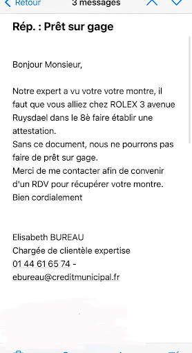 Sachez avant d'y aller que vous attendrez au total 3h et que vous serez obligés d'accepter une offre de prêt ou de mise en vente à 30% de la valeur de vos objets ! Je m'explique : même quand vous avez rdv, vous avez 1 heure d'attente pour déposer vos objets : attention ils ne prennent ni les sacs de marques ni les carrés d'une célèbre marque sous prétexte qu'il faut les factures mais c'est surtout qu'ils n'ont pas l'expertise, car quand il s'agit de prendre des montres ou des bijoux en or là par miracle pas besoin de factures. Bref, vous attendez ensuite 1h de plus pour recevoir votre estimation. Et là, après 2h d'attente, (vous êtes bien énervé d'avoir attendu car il n'y a pas assez de sièges pour le nombre de personnes), ils vous proposent un prêt immédiat équivalent à un tiers de la valeur de vos objets. Pour que vous compreniez : si vous arrivez par exemple avec +/-1000€ de valeur bijoux, ils vont automatiquement estimer le lot à -50% pour arriver à leur estimation de 500€. Ensuite ils vous prêtent immédiatement 60% de ces 500€ soit 300€. Forcément vous êtes très déçus, vous ne pouvez absolument pas négocier ou encore moins enlever un objet car sinon vous êtes repartis pour une nouvelle estimation et une heure d'attente....donc comme vous avez attendu 2h donc vous ne pouvez qu'accepter leur offre de @@@@@. Important : ils ne prennent pas en compte les estimations extérieures des bijoutier, marques ou certificats d'origine. Je suis plus que convaincue que le délai d'attente fait partie de la stratégie pour forcer les gens à accepter une offre des plus basses, vous avez tellement attendu que vous ne pouvez pas refuser. Bref, une fois l'offre de prêt de @@@@@ acceptée aurez ensuite le choix de rembourser ce prêt ou le mettre en vente au bout de 3 mois. C'est l'option vente que j'ai choisie, pour espérer arriver à leur estimation la plus basse et récupérer les 40% restants. Enfin, cerise sur le gâteau et véridique, vous attendrez 1h de plus...
