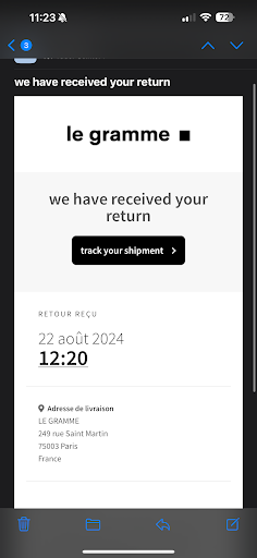 So I asked for returned. Parcel back to DHL on 11/8. And arrived in Paris 16/8. It was stuck in custom for 11 days! DHL said the documentation for tax exemption for return product was not completed. DHL contacted Le Gramme but no reply. So Le Gramme was fully aware of it for 11 days and did nothing! Then today, 27/8, the custom is sending the parcel back to me! How unethical! Business scam to refuse return by on purposely refusing to do the proper paperwork and trying to escape refund!