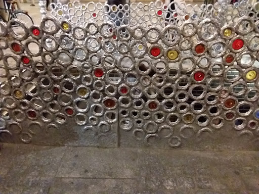 Le KIOSQUE des NOCTAMBULES , Jean-Michel Othoniel ( 2000 ), Place Colette Oeuvre d’art contemporain installée sur la sortie / bouche de métro de la station Palais Royal – Musée du Louvre, formée d'un ensemble de sphères d'aluminium et de verre de Murano, donnant sur la Place Colette, devant le bâtiment du Palais-Royal et de la Comédie-Française, Paris (1er) . Commandée au plasticien français Jean-Michel Othoniel pour le centenaire de la construction du Métro de Paris, en 2000, installée la même année et inaugurée le 30 octobre. L'œuvre prend la forme d'une installation ayant la fonction d'une bouche de métro. À l'extérieur, une résille métallique en aluminium formée d'anneaux liés les uns aux autres entoure l'escalier sur trois côtés ( hormis celui qui permet de l'emprunter ) ; elle est sertie de quelques anneaux de verre coloré. Six colonnes formées de sphères d'aluminium ( trois de chaque côté de la bouche ) supportent deux coupoles. Ces coupoles sont composées d'un ensemble de perles géantes en verre de Murano ( réalisées par la verrerie Salviati ) qui semblent enfilées les unes après les autres pour former deux structures en forme de dôme. La coupole qui surplombe l'entrée de l'escalier est formée de perles aux tons chauds ( jaune, blanc et rouge ) et figure le jour ; l'autre possède des tons froids ( bleu, blanc, jaune et violet ) et figure la nuit. Chacune des coupoles est surmontée d'une petite sculpture d'un personnage en verre. L'arrière de l'œuvre comporte un banc public, lui aussi construit en aluminium. La partie intérieure de l'œuvre, située peu après la fin de l'escalier, contient deux vitrines encastrées dans le mur du métro. Elles contiennent des perles colorées ; l'une des vitrines possède des tons chauds, l'autre des tons froids, à l'instar des deux coupoles à l'extérieur. En outre, le carrelage du métro est peint, sur cette entrée, d'une couleur dorée ; il retrouve sa couleur blanche classique un...