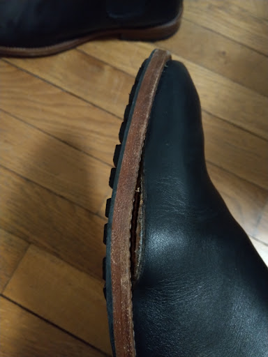 Venons-en au montage Ă prĂ©sent : le cousu Blake est certes moins rĂ©sistant que le Goodyear, mais avec P&F les dĂ©collements pĂ©riphĂ©riques sont rĂ©currents c'est dommage. Ăa se traite chez le cordonnier mais on est malgrĂ© tout en droit de s'attendre, avec les prix pratiquĂ©s, Ă ne pas devoir y aller pour ça.