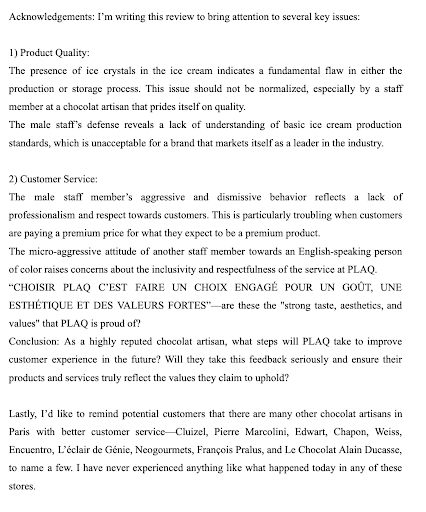 Read moreEvery time in Paris I love going to PLAQ, but today’s visit has been a little disappointing. I had nice memories from the summer of 2021 when we had a wonderful chocolate ice cream there (I’m adding a photo for comparison). So, today I wanted to have just one scoop of ice cream again since the weather was nice and warm. I asked the shop assistant to give me one scoop, but she responded that they only do two scoops (why?). Strange, but I said ok, I’ll take two scoops (for 7.5 euros!). Sadly, what I discovered in my little pot had nothing to do with ice cream. It was just quite rich chocolate cream. I had a couple of spoons and returned to the shop to ask for a take away cup. I asked the girl who sold me the ice cream if it was well the ice cream that she gave me and she responded affirmatively. Well, I felt like it was “c’est n’est pas une pipe” experience when you know that something is clearly not what you are told it is. Obviously 4 hours later my “ice cream” pot i still has the same shape and form as when I bought it.(see the second photo) Do we agree the real ice cream would have melted? (So, perhaps it’s worth renaming the ice cream into chocolate cream not to mislead the customers and since it is soo rich, honestly one scoop is more...