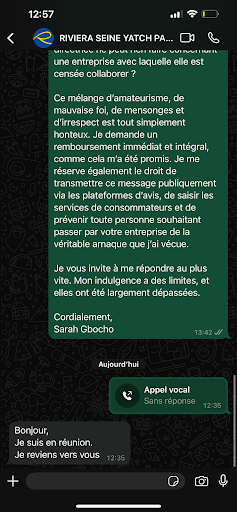 Sur place, je demande à parler à un responsable : on me balade. – “La directrice ne pourra rien faire.” – “Je peux vous donner le numéro du skipper, c’est le seul contact que j’ai.” – “Je ne gère pas cette partie.” Bref, personne n’assume, personne ne prend la responsabilité, et surtout personne ne me donne le contact du vrai décisionnaire.