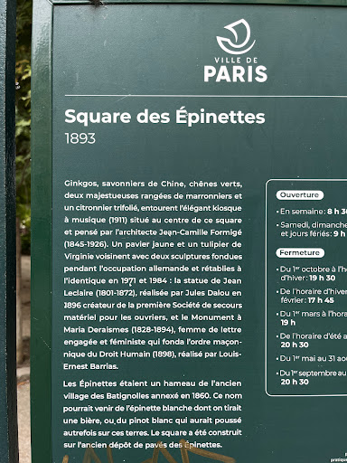 The Square des Épinettes is a green space in the Épinettes district of Paris. It was created in 1893 by Jean-Camille Formigé. Two sculptures in the garden represent famous personalities of the area: Maria Deraismes, a feminist, and Jean Leclaire, an entrepreneur. It covers 10.42 hectares.