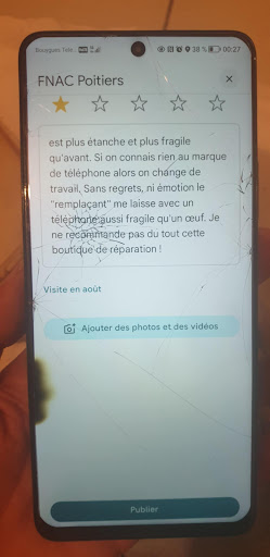 Read moreBonjour,trĂšs trĂšs trĂšs déçu đ€đĄđ du service aprĂšs vente.Jeudi 9 aoĂ»t ,je viens rĂ©cupĂ©rer la trotinette Ă©lectrique de mon fils qui au bout d'un mois d'achat, dĂ©jĂ la batterie dĂ©faillante. Donc je la rĂ©cupĂšre au bout de 3 semaines,batterie changĂ©, avec 6 mois d'extensions de garantie. Jusque lĂ tout va bien et lĂ la personne du service aprĂšs vente arrache le bon de retour sans se prĂ©occuper qu'il Ă©tait scotchĂ© sur le stikers de la marque de la trotinette . HĂ© bien forcĂ©ment, une partie du stikers abĂźmĂ© et en plus de ça la colle du Scotch dĂ©bordait de partout. Donc forcĂ©ment ça m'Ă©nerve, et je lui en fait part. Pour lui ,c'Ă©tait normal, aucun mot,rien Ă dire. Je suis extrement mĂ©contente du service. Donc on dĂ©pose un produit tout neuf au service aprĂšs vente et puis vous le rĂ©cupĂ©rer en mauvaise Ă©tat. C'est un manque de professionnalisme de la part d'une grande enseigne comme la fnac. Dommage, je ne peux pas poster de photos de ma trotinette. Vous savez c'est la premiĂšre fois que je poste un commentaire, mais lĂ je suis vraiment vraiment en colĂšre, surtout pour mon fils de 15 ans qui s'offrait sa premiĂšre trotinette, avec son argent Ă©conomisĂ© depuis des mois. Quelle image vous renvoyer pour le jeune consommateur!!! Lui aussi est déçue de son premier gros achat. J'espĂšre vraiment un retour de votre...