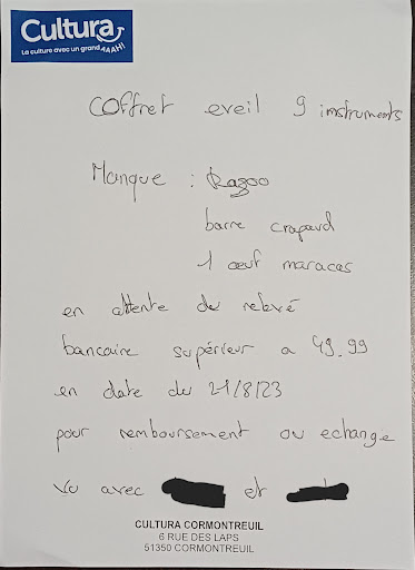 Read moreA fuire !! Un scandale !!!!! Très mauvaise expérience... Je me suis limite faite traitée de voleuse par un employé supposant faisant partie de l'entreprise cultura ou entreprise de sécurité ou peut être même un civil qui sais-je... pas d'indication sur le personnage ! Tout ça parce que je n'avais pas acheté tous les livres que la vendeuse m'avait conseillé !!! Je m'explique. J'ai demandé conseil à une conseillère du rayon livres pour acheter des livres pour enfants, autocollants et livres d'histoires pour le soir, la conseillère m'en a donné plusieurs en main, je n'ai forcément pas tout acheté, j'ai dû faire un choix et après avoir payé, le supposé "vigile" m'a demandé pour vérifier mon sac parce que je n'avais pas acheté un livre proposé, non mais j'hallucine !! J'ai vidé mon sac sur la caisse, j'ai ouvert ma veste et j'ai demandé le remboursement par principe ! Mon fils n'aura pas eu ses livres ce soir, j'étais tellement dégoûtée... J'irai acheter les mêmes produits chez leur concurrent (à...
