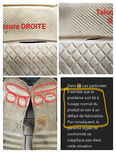 Site marchand à EVITER ! Suite constat de défauts de fabrication importants sur les deux semelles (voir photos), le service client a refusé de reprendre l'article, prétextant que c'était de l'usure, dû à l'usage normale des chaussures (voir impression d'écran).